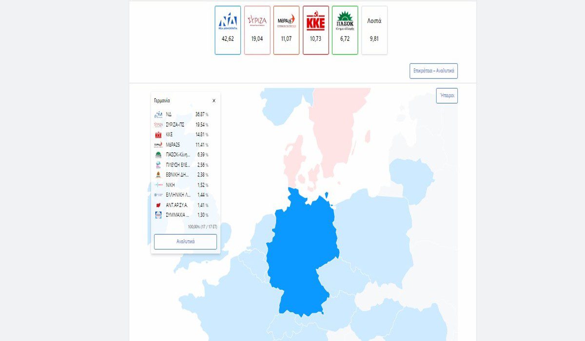 Ο κερδισμένος στην μάχη της κάλπης είναι αναμφισβήτητα η ΝΔ που εξελέγει με συντριπτικό ποσοστό 36,87%. Το ΚΚΕ συγκέντρωσε 14,81% και βρέθηκε στην 3η θέση μία θέση πάνω από τα αποτελέσματα στην Ελλάδα. Ο μεγάλος χαμένος στη Γερμανία, πέρα την συντριβή του ΣΥΡΙΖΑ, είναι η Ελληνική Λύση με ποσοστό 1,44% βρέθηκε στην 9η θέση και αν υπολογίσει κανείς ότι υπήρχαν δύο υποψήφιοι από Γερμανία και ότι ο πρόεδρος του κόμματος γεννήθηκε στη Γερμανία το αποτέλεσμα είναι καταστροφικό για το κόμμα του Κ. Βελόπουλου.