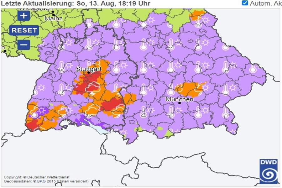 Από τις 4.51 μ.μ. της Κυριακής (13 Αυγούστου), η Γερμανική Μετεωρολογική Υπηρεσία (DWD) έχει εκδώσει προειδοποίηση για έντονα καιρικά φαινόμενα για αρκετές περιοχές μεταξύ Άουγκσμπουργκ και Μονάχου.